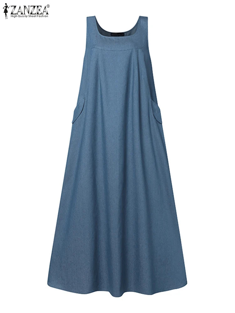 Embrace casual elegance with this versatile denim sundress. Featuring a sleeveless design and loose, comfortable fit, this dress is perfect for warm weather and everyday wear.