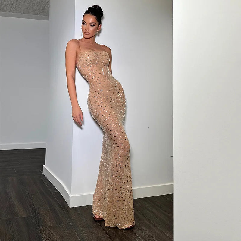 Make a grand entrance in this stunning evening gown. Elegant beaded straps and a dramatic long tail create a sophisticated ball gown silhouette perfect for weddings and formal events.