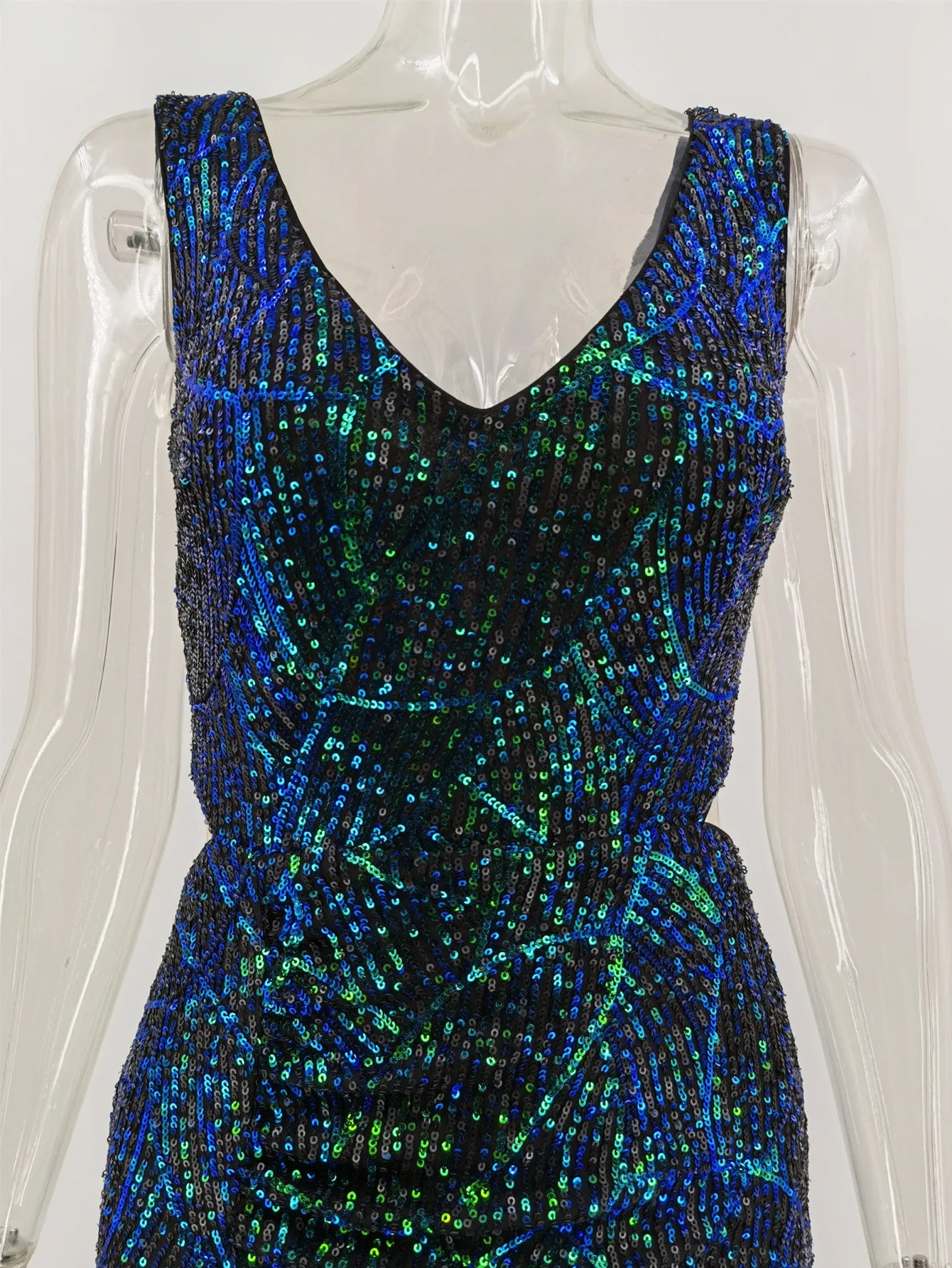 This stunning bodycon dress features sparkling sequins, bandage design, and a sexy slit with hollow out details.